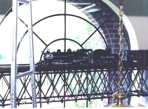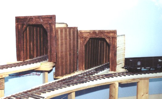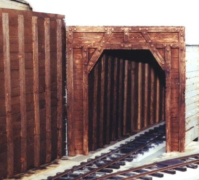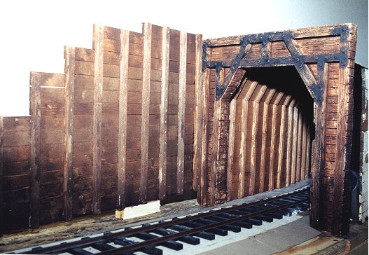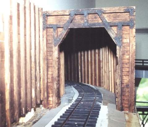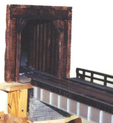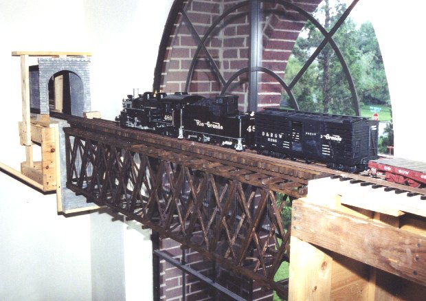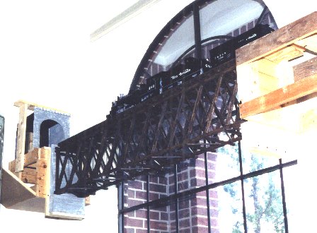 On Saturday, September 8th, 2001, the Howe Truss bridge was installed on the "High Line", replacing the temporary structure that spanned the big foyer window. Also notice the tunnel portals get entrances and tunnel lining.