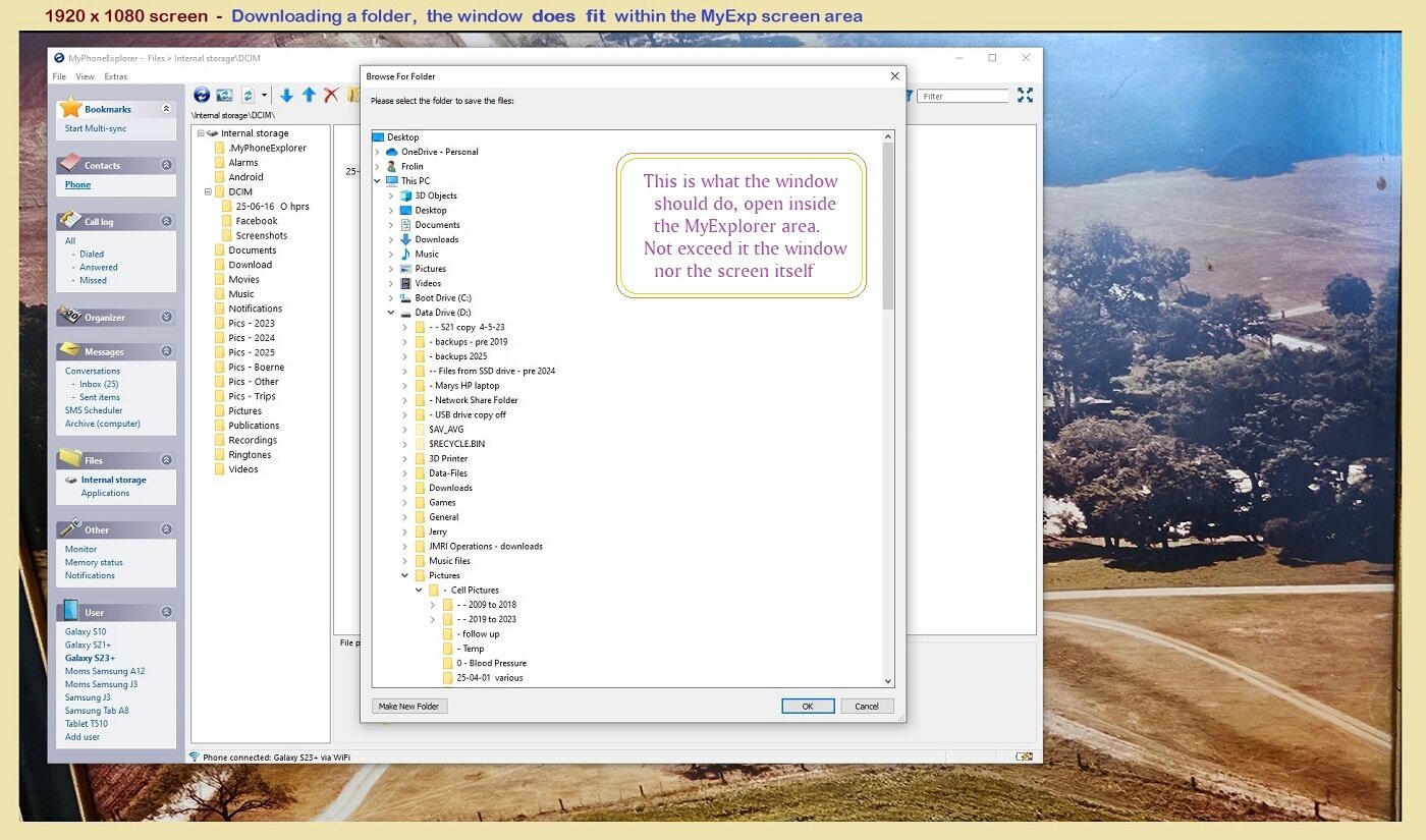 When you select a 'folder' to download, the pop-up window to select where on the PC, the window exceeds the screen area. Not just the MPE window, but goes outside the actual monitor screen area. Happens on two PC systems, each have 2 or more monitors, one has four screens with two 4x3 and two 16x9 format.
